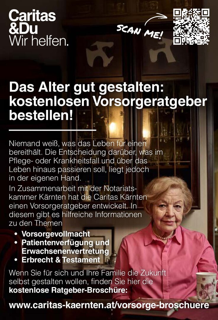 In Zusammenarbeit mit der Notariatskammer Kärnten hat die Caritas Kärnten einen umfassenden Vorsorgeratgeber entwickelt, der wichtige Fragen rund um das Thema Vorsorge verständlich erklärt: